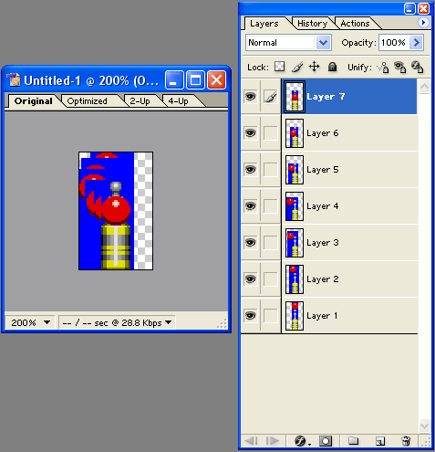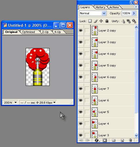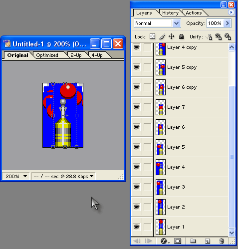 Теперь давайте разместим все слои-кадры в порядке их следования в анимации, для чего нужным образом перетащим слои (для перетаскивания нажмите на строку слоя и, не отпуская кнопки мыши, передвиньте вверх или вниз) и придадим им порядок снизу вверх (или наоборот): Layer 1, Layer 2,... Layer 7, Layer 6 copy, Layer 5 copy,... Layer 2 copy (и всё-таки ориентируйтесь не по названию, а по маленькой иконке-пиктограмме слоя, ведь это лишь один из вариантов расположения, который "сработает" у вас только в том случае, если вы в точности повторяли выше описанные действия). Вот то, что у нас получилось.