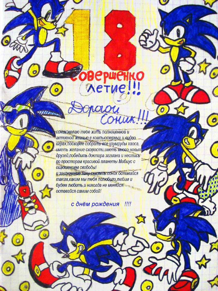 23 июня 2009 года нашему с вами любимому синему ежику исполняется 18 лет! Такое событие невозможно оставить без внимания, и мы приготовили еще один сюрприз для всех наших постетителей - конкурс на лучшую поздравительную открытку ко дню рождеия Соника! >>>