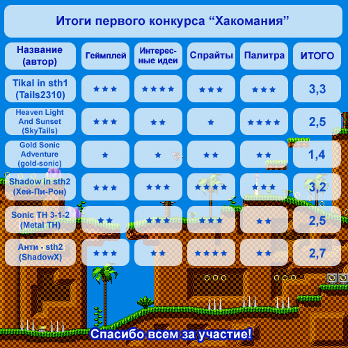 >>> К большому сожалению, действительно хороших хаков на конкурс поступило очень мало. Часть хаков были недоделаны, часть содержали интересные идеи, но, увы, не демонстрировали их достойного воплощения... Первые места, как видно из таблицы, заняли хаки от Tails2310 и Хей-Пи-Рона. Несмотря на некоторые недоработки, именно в этих работах можно увидеть многочисленные оригинальные новшества (особенно в первой), а также добротный уровень общего исполнения. Хей-Пи-Рону, наверно, не хватило чуточку фантазии для того, чтобы догнать и обогнать Tails2310. Я желаю удачи все участникам в последующих конкурсах, а победителя, Tails2310, поздравляю с победой!